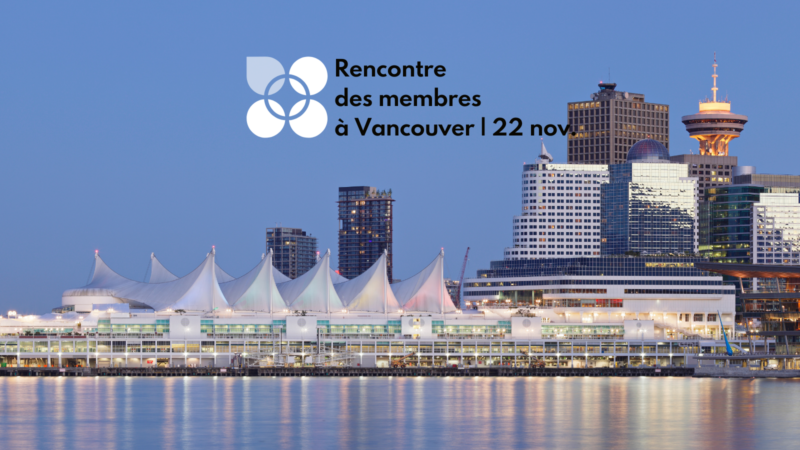 En ligne En personne Rencontre régionale des membres à Vancouver 23 novembre 2023 / L'inscription est close Publié: août 26, 2023 Événements En ligne Rencontre régionale des membres à Vancouver Nous avons le plaisir de vous inviter à une réunion spéciale des membres à Vancouver, qui sera l’occasion de renouer avec des pairs basés dans la région et de rencontrer les membres du conseil d’administration de PFC lors d’une causerie informelle sur leurs perspectives et leurs visions de la philanthropie. Où : Salle Penderel, au SYLVIA HOTEL on English Bay (1154 Gilford St, Vancouver, BC V6G 2P6). Cet événement est ouvert aux membres du conseil d’administration et au personnel des membres de FPC basés dans la région du Grand Vancouver et ailleurs en Colombie-Britannique, ainsi qu’aux fondations qui envisagent fortement de se joindre à FPC. Inscription Merci de vous inscrire ci-dessous. Nous nous réjouissons de vous voir bientôt !