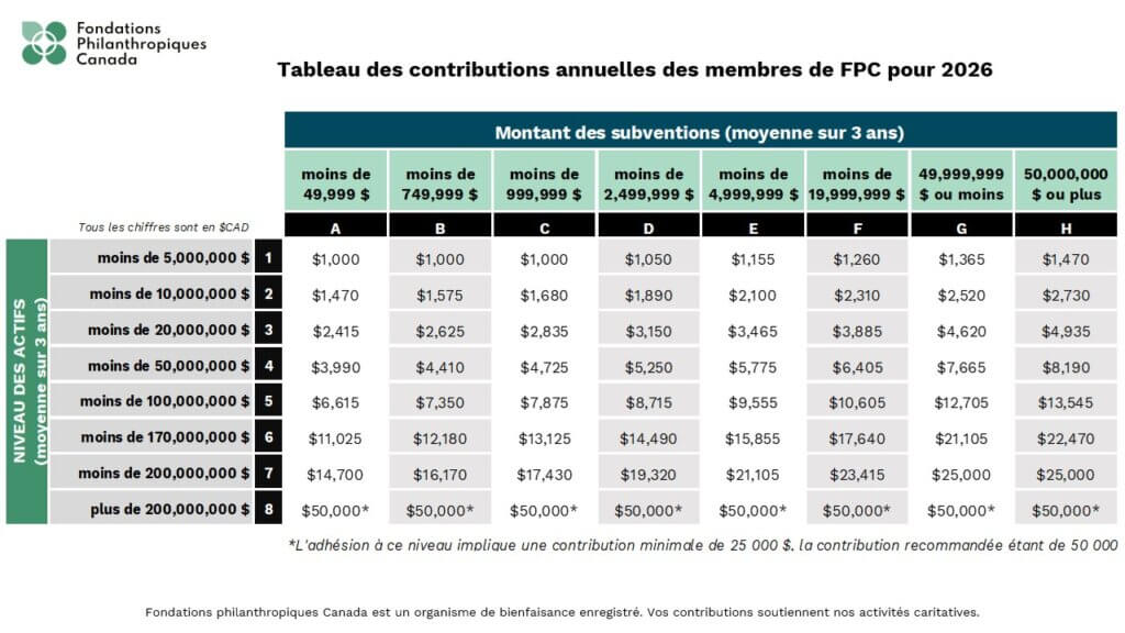 Documents FPC Contributions d’adhésion Publié: novembre 10, 2022 Télécharger Documents Documents FPC Contributions d’adhésion Les contributions annuelles des membres sont déterminées par un calcul de la moyenne sur trois ans des actifs de votre organisation et de la moyenne sur trois ans des subventions accordées par votre organisation. Pour 2026, le niveau de contribution est calculé à partir des données de 2021, 2022 et 2023. FPC utilise les données publiques les plus récentes du formulaire T3010 (lignes 4200, 5045 et 5050) ou, à défaut, les chiffres des états financiers vérifiés soumis. Le montant minimum de la cotisation est de 1 000 dollars canadiens.